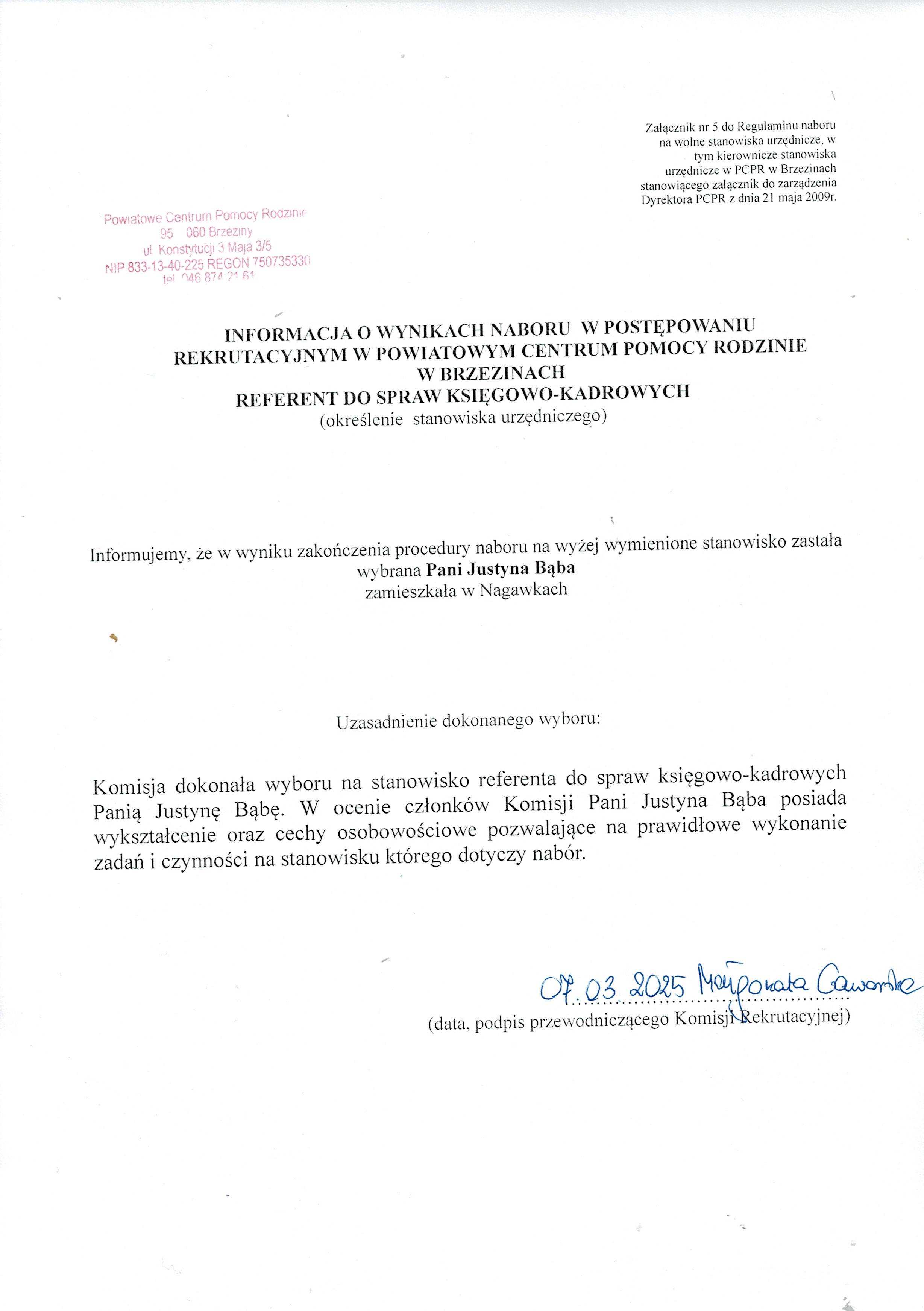 Informacja o wyniku naboru
